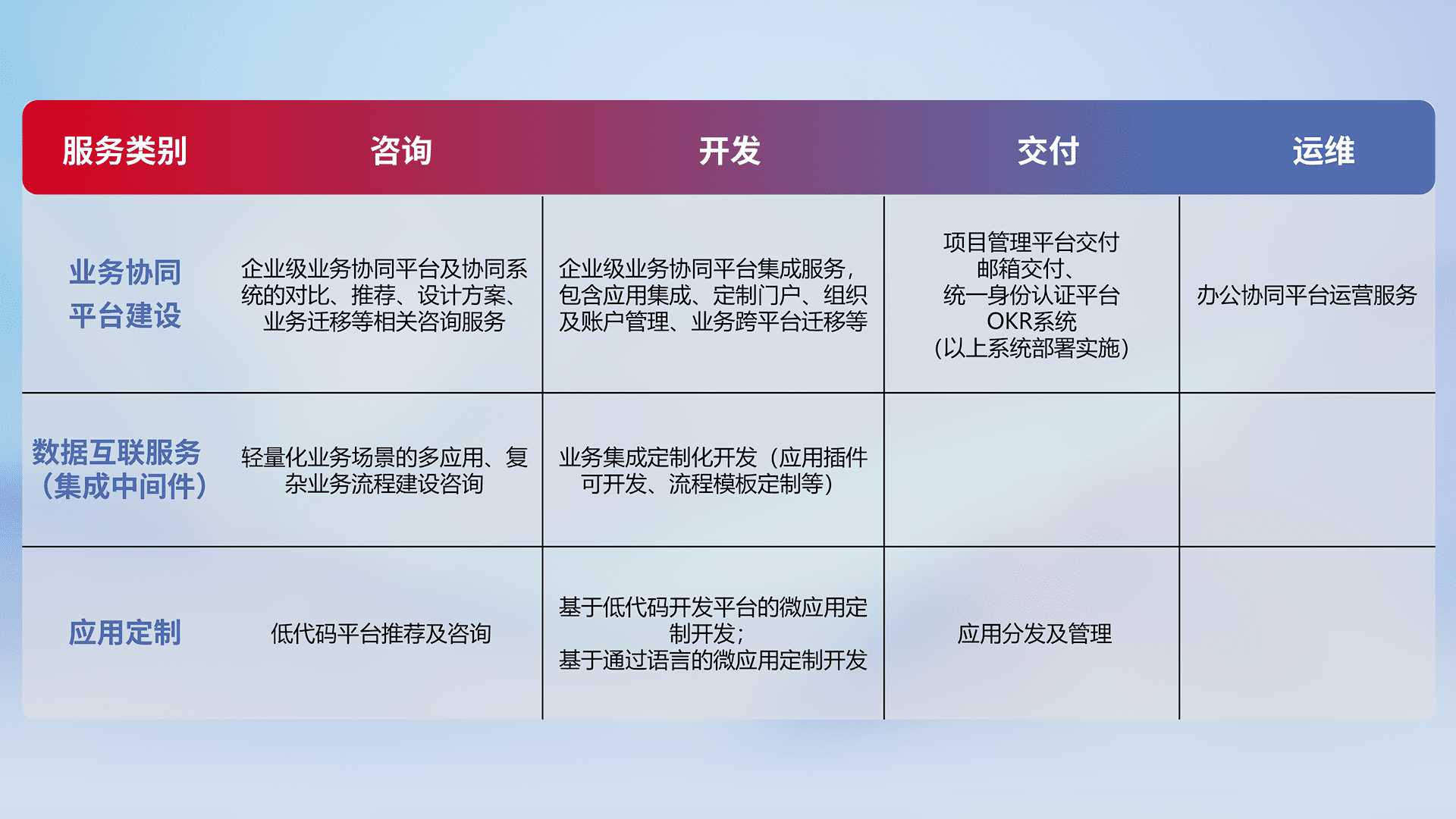 针对钉钉、、企微、、IDaas等平台级产品提供产品的规划、、、、方案、、、交付、、、定制化开发等服务,,,,实现如统一协同办公、、智能客户服务、、、、混合会议管理、、智能数据查询、、、、等业务场景,,,实现数字化转型。。